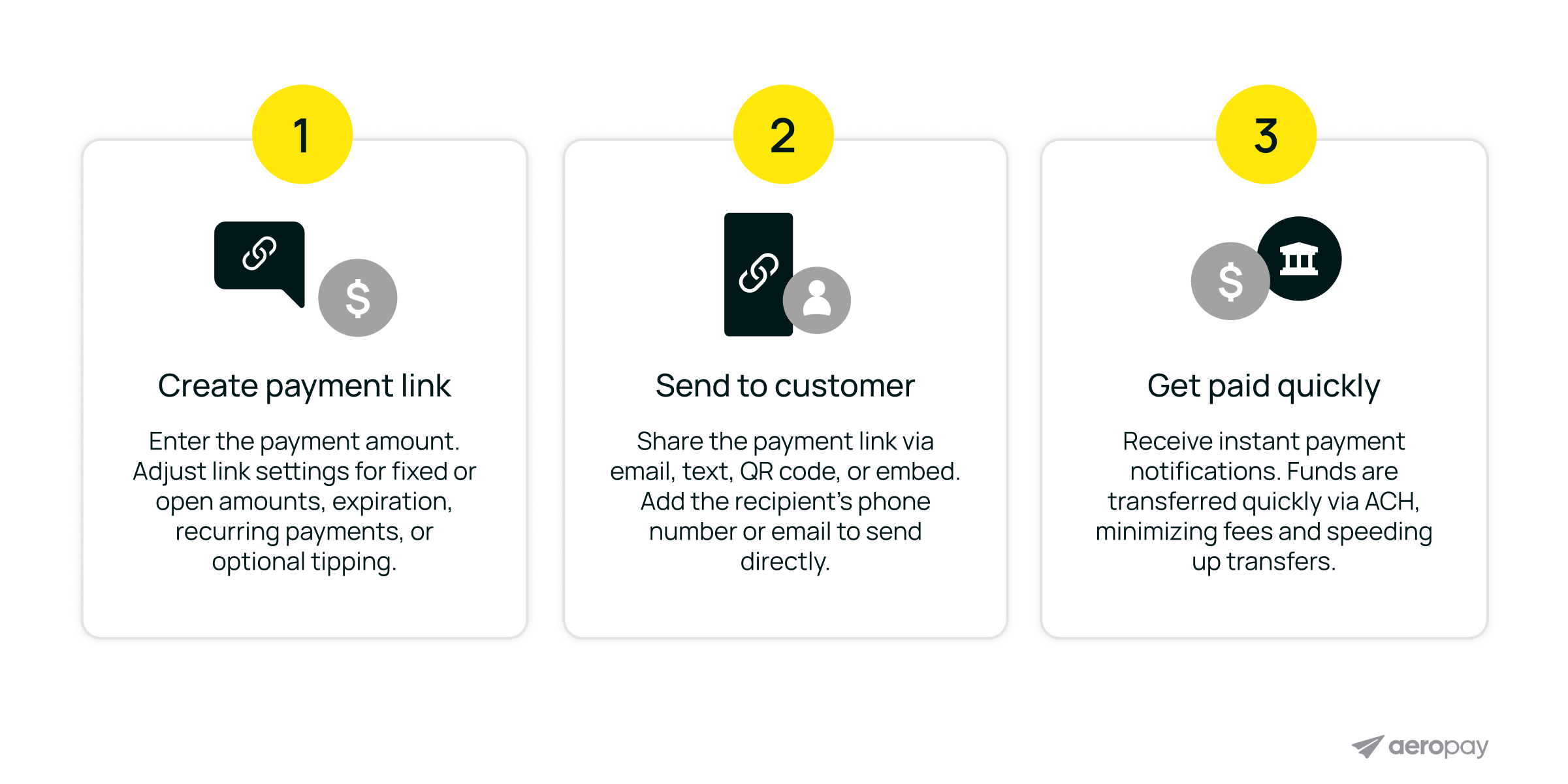 By implementing and embedding payment links for checkouts, businesses increase speed to payment. Aeropay data found the average payment link is paid within 2.5 minutes after being sent.