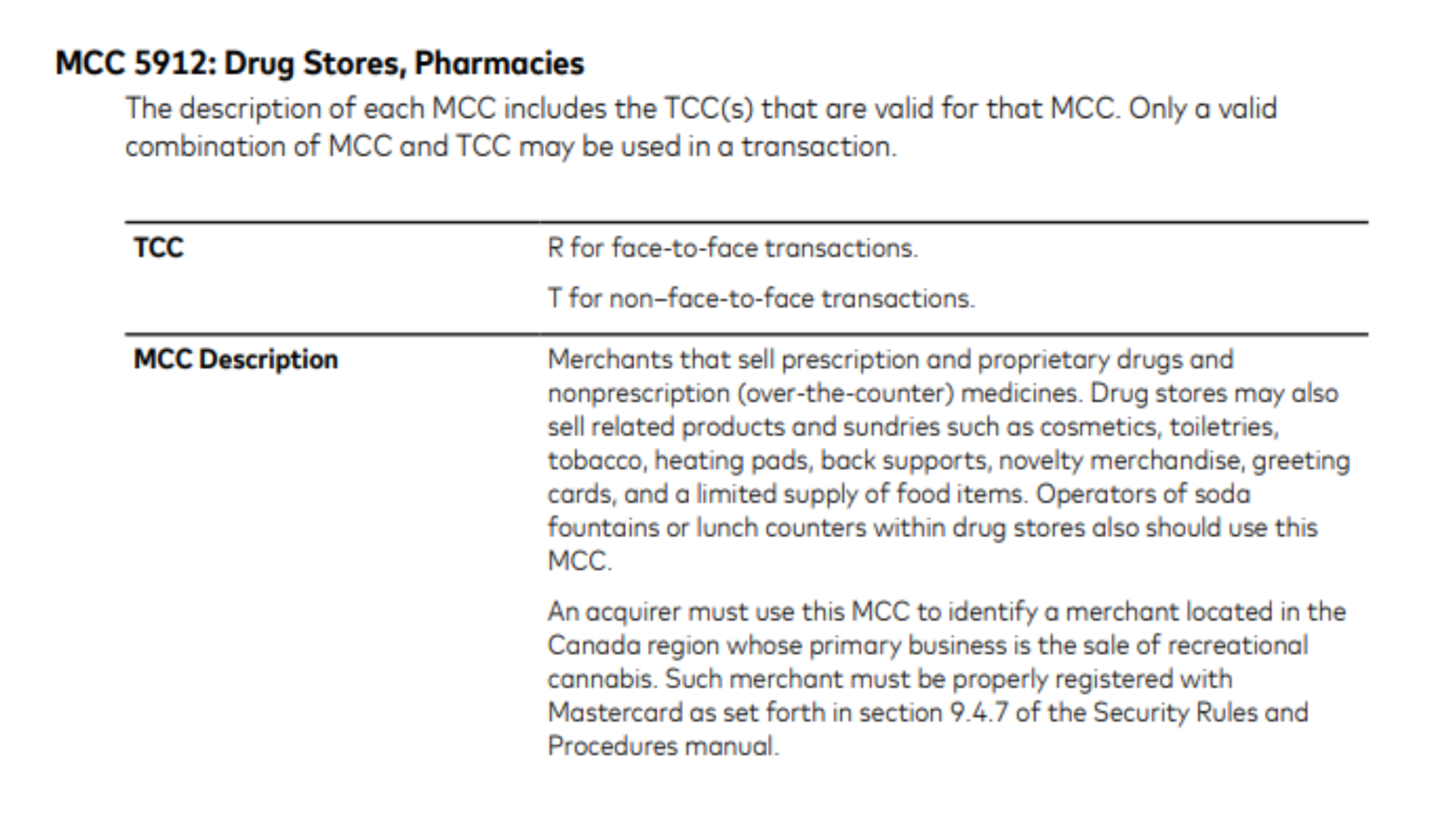 Up to this point, there is nothing unusual about the transaction until you look at how the PIN Debit processor codes it. MCCs (merchant category codes) are used to identify the industry that a receiver of card payments is in. PIN Debit providers tout that the MCC code 5912 is compliant to utilize in the United States for legal cannabis transactions, but this statement is inaccurate. 5912 was created for traditional drug stores & pharmacies and has recently been considered the appropriate code for legal cannabis transactions in Canada (where cannabis is federally legal) but not the United States (where cannabis is not federally legal).