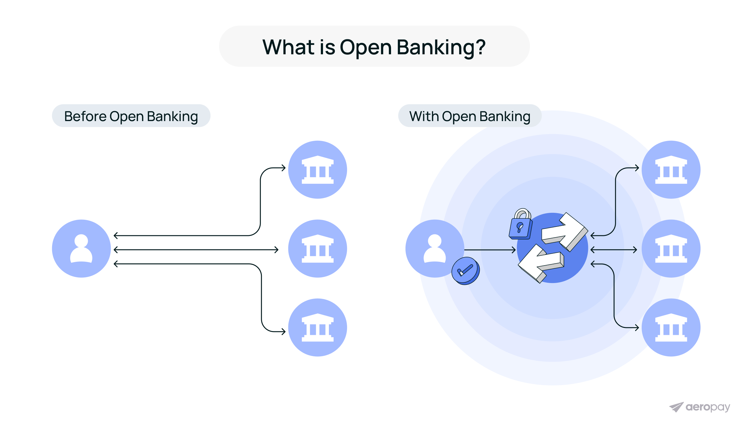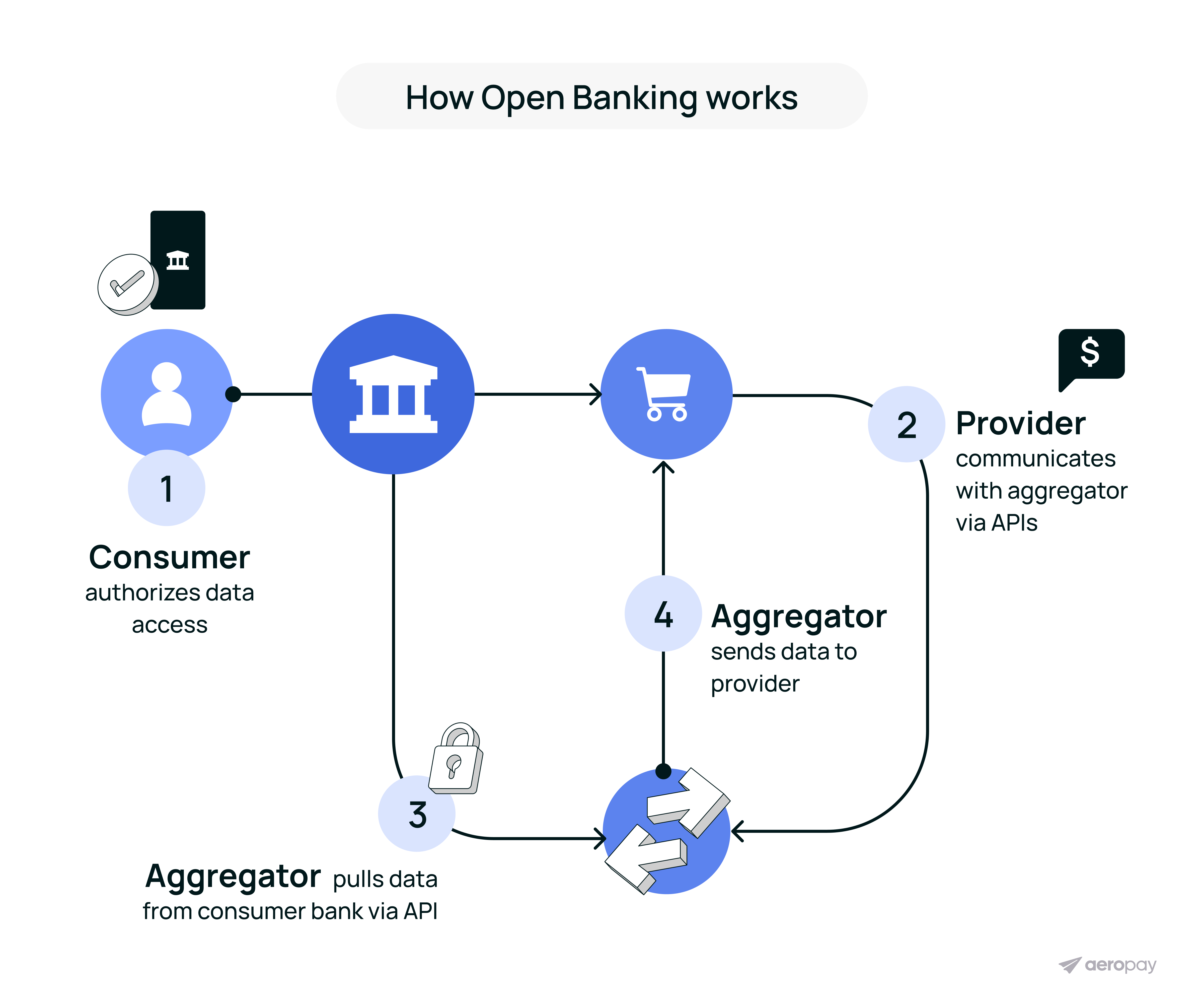 Open banking payments are enabled with a third-party provider, like Aeropay, which establishes a secure connection between consumer bank accounts and merchants via API.